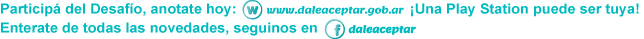 El Desafío Dale Aceptar entregará: Play Stations y otros premios más a las mejores animaciones y juegos desarrollados en Rebeca. Para conocer los detalles sobre los galardones, ingresá en Premios. |
