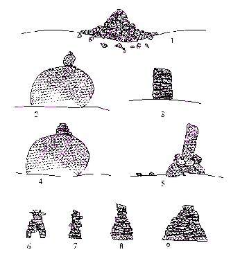 Los dibujos representan la morfología tipo de los diferentes marcadores espaciales del paisaje prehispánico: 1) Apacheta; 2, 4, 7 y 8) mojones de caminos; 6) Animita-mojón; 3, 5 y 9) Sayhuas.