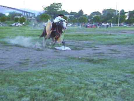 En esta escena el jinete inicia un circuito donde debe hacer blanco en cinco objetos especificos. Esta destreza rememora la valiente lucha de los Gauchos en la Guerra por la Independencia.