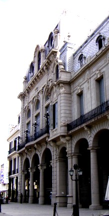 La fachada, dividida en tres niveles correspondientes al ingreso, la planta noble y la mansarda, concilia los lineamientos del academicismo francés en los dos niveles superiores, con la recova inferior, constituida por tres grandes arcos neorrenacentistas que no sólo no restan armonía al conjunto, sino que lo integran con su entorno circundante, de neto tono hispánico e italianizante.
