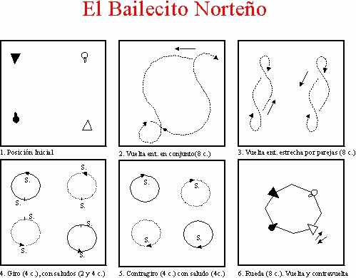 5) Ubicación inicial : ambos bailarines enfrentados en los extremos de la mediana, paralela al plano del espectador, del cuadrado imaginario de danza, el caballero ofreciendo flanco izquierdo al espectador y la dama flanco derecho.