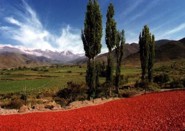 Sobre el camino desierto, el ripio a veces rojo, a veces negro, sólo algún rancho de piedra o un corral de pircas interrumpe la soledad del paisaje.