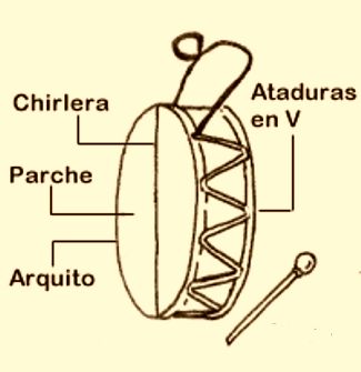 Tiene dos parches en cuya periferia llevan cosido un anillo fino de madera (arquito), que el mismo cuero envuelve. Los parches, de cuero, a ambos lados, y atados entre si por medio de un tiento en forma de zigzag. El diámetro de la membrana es de aproximadamente 33 cm. Posee, sobre el parche superior, un hilo llamado "chirlera" y una manija que sale de los tientos. Uno o dos palillos completan el instrumento.