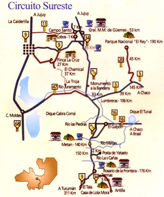 Saliendo de la Capital con rumbo sureste se inicia un circuito de rico contenido histórico, ya que pueden visitarse lugares como Finca La Cruz, Quebrada de la Horqueta, Fuerte de Cobos y Posta de Yatasto, escenarios de la gesta güemesiana por la independencia, tierra de gauchos, tradiciones y costumbres. A estos valores se suman los que la tierra ofrece desde sus entrañas: las aguas termales en Rosario de la Frontera.