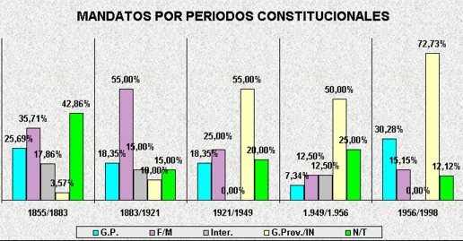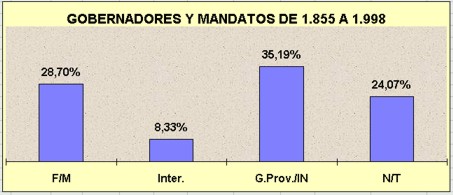 Tomando estos dos grandes periodos, podemos decir que el 44,04% de los gobernadores lo fueron hasta 1.921 y desde allí, hasta el presente, gobernaron el 55,96% restante. En principio y para los fines del presente, analizaremos los periodos por medio de cuatro variables caracterizadas por aquellos gobernadores que Finalizaron el Mandato (F/M), es decir que gobernaron por el periodo completo por el que fueron electos, la segunda de gobernadores Interinos (Inter.), aquellos elegidos para completar mandatos o por situaciones excepcionales, la tercera de Gobiernos Provisorios o Intervenciones Nacionales (G.Prov./IN) que incluye a los gobiernos de facto y los delegados del Poder Ejecutivo Nacional y por último, la categoría de aquellos gobernadores que No Terminaron mandato (N/T) por razones de renuncia o destitución.