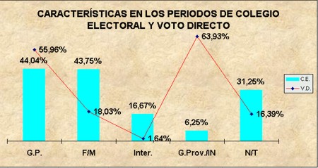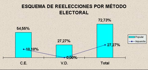 Observamos que el 54,55% de las reelecciones se efectuaron por voto popular en periodos de vigencia del Colegio Electoral, mientras que el 18,18% de las mismas lo fueron en periodos de Voto Directo, mientras que el 27,27% de las reelecciones fueron impuestas y éstas se realizaron en periodos de Colegio Electoral, siendo destacable que durante el periodo de voto directo no existieron reelecciones impuestas.