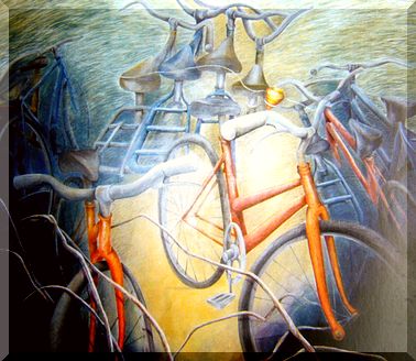 En sus pinturas establece la poética del paraíso perdido. Estas obras inquietantes, organizadas desde una marcada diagonalidad, muestran un universo de estructuras retorcidas, restos de elementos destruidos por el tiempo y el uso, sumergidos en profundas sombras que establecen permanentes contrastes con luces sabiamente dispuestas, a partir de una rica gama de ocres y tierras. Y ahí está aquella entrañable bicicleta, colocada generalmente en un atrevido escorzo, provocativa e inolvidable. El dibujo impecable la muestra tal como permanece en nuestra evocación: los rayos, la cadena, el manubrio con brillante cromado; es metálica y sustenta una parca cromaticidad. Pero la mirada sigue indagando entre bicicletas y alambres, entre luces y sombras y siempre, en cada obra, descubre un trompo de madera de brillante colorido, un molinete, un barquito de papel. Entonces emerge, desde la complicada trama de la vida, la simplicidad y la inocencia de la infancia, de esa infancia desde donde, como lo afirmara Sábato, se construye la vida.