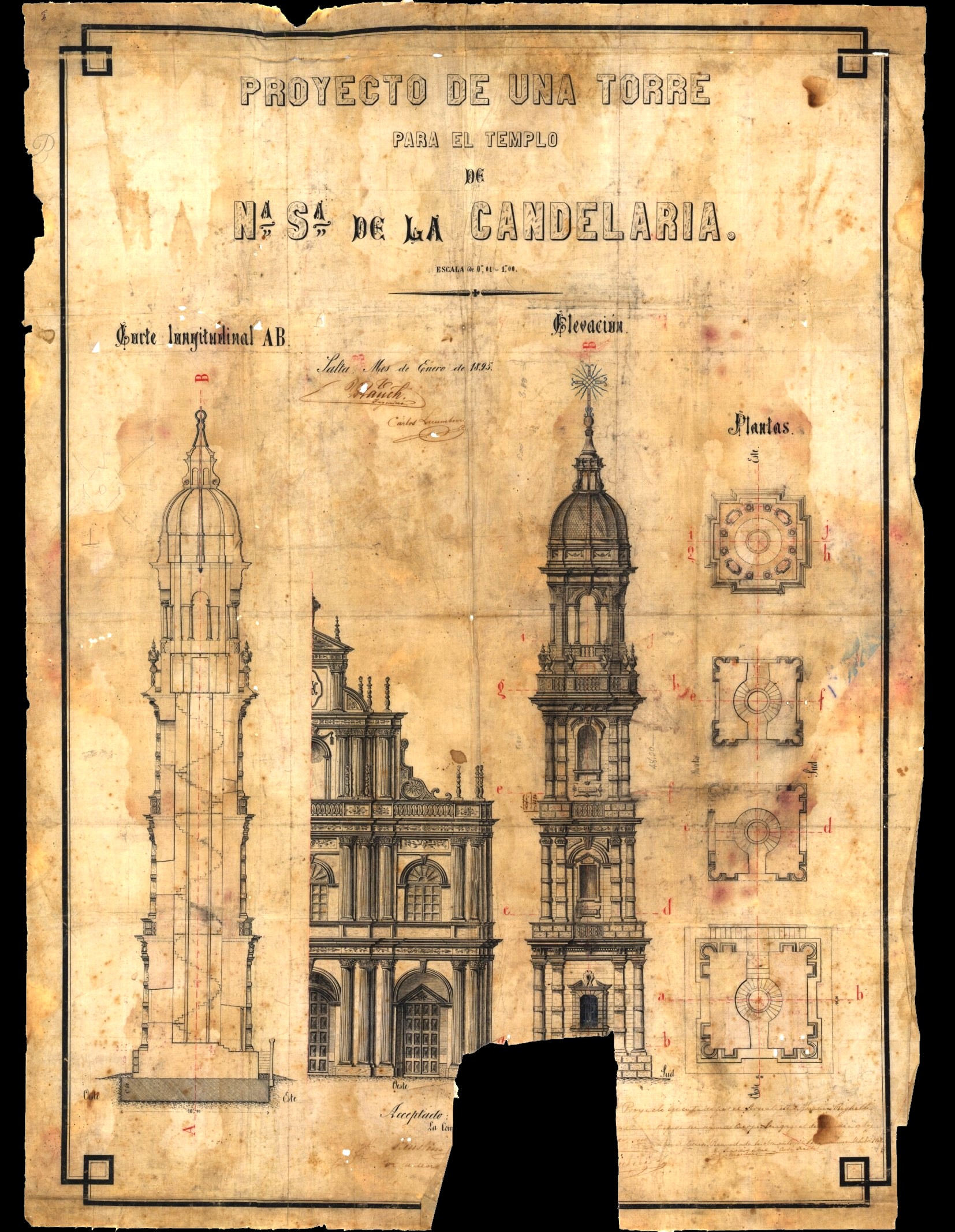 La torre, separada del cuerpo del templo, fue un proyecto de autoría del ingeniero civil y ferroviario alemán Josep Heinrich Theodor Rauch (José Enrique Teodoro Rauch) cuya ejecución se inició bajo su dirección, pero fue interrumpida y reanudada por el italiano Francisco Righetti, que la terminó en 1908 conjuntamente con la refacción de la fachada.