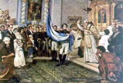 Por tercera vez despliega la bandera celeste y blanca ante el ejército formado. "Éste será el color de la nueva divisa con que marcharán al combate los nuevos campeones de la patria", les dice. Y luego, personalmente, y en forma individual, toma juramento a los soldados. Sobre una margen del río se yergue un árbol eminente y frondoso. Cuando los ecos de la marcha de1 ejército se pierden a lo lejos, sobre el gigante vegetal, mudo testigo de la emocionante ceremonia, queda prendido en su tronco, una tablilla, grabada a punta de cuchillo, donde se lee Río del Juramento.