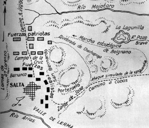 el Campo de Castañares, al fondo el ejercito real y la ciudad de Salta, esta