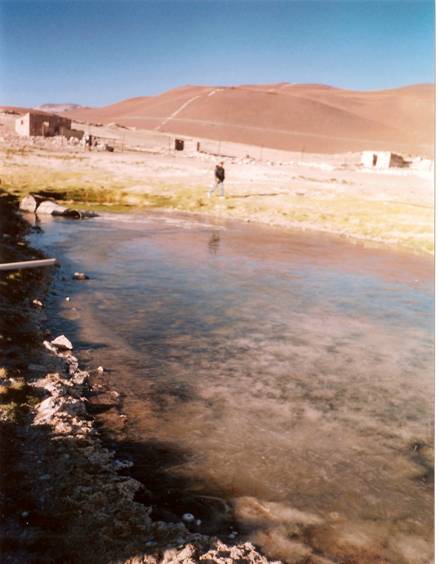 Siempre tomando como punto de referencia, la capilla hacia la izquierda y bajando 150m aproximados se encuentra un ojo de agua dulce. Este preciado bien tiene un diámetro de 4m o casi. Es un oasis para la zona. Convergen allí, viajantes, ex –residentes, vicuñas, zorros y turistas que se quedan fascinados por las bondades que le ofrece la naturaleza, a pesar de lo agreste que a veces se torna el paisaje, sobre todo cuando las fuertes ráfagas del viento. “La Vega” como le llamamos los ex – residentes tiene una particularidad. No se congela la parte circular porque en forma permanente está en ebullición, fenómeno que se visualiza a simple vista. En cambio la parte más explanada como si fuera un anexo, es menos profundo siempre amanece todo congelado. Estamos informados que la gente que trabaja en la “Minera La  Puna S.A.” viene a llevar agua en grandes camiones, para uso de su personal. A una distancia cercana a ésta vega, se encuentra todavía unos depósitos de cemento canalizados, de donde se extrae el agua potable para consumo humano.
