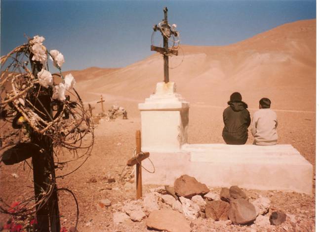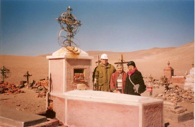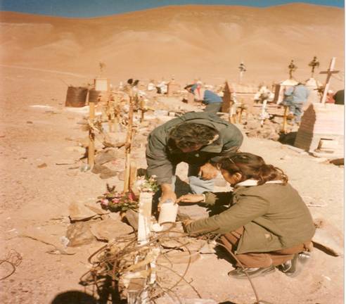 Señora Teodolinda Rojas e hijo en la tumba de un ser querido.