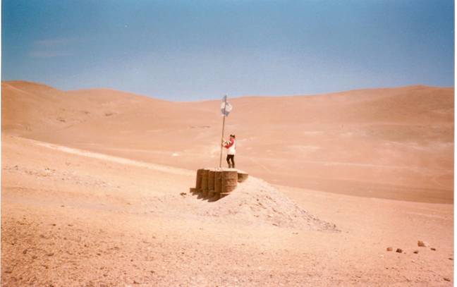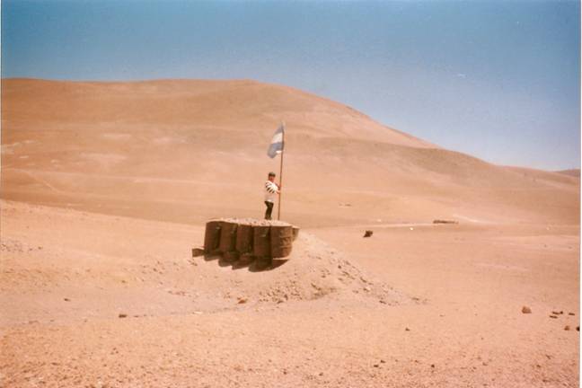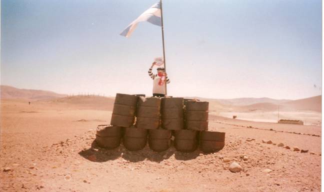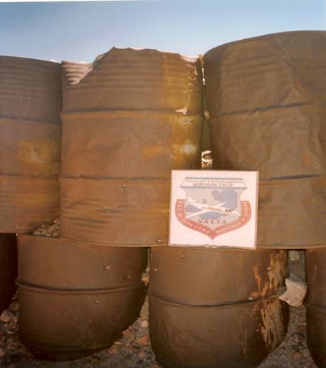 El dato curioso es que los tachos están perforados por balas. No se encontró en el lugar ningún resto, como para confirmar ésta teoría. A una distancia casi de 100 metros casi en descenso, se encuentra otra fila similar. Consultado a los más antiguos residentes que me acompañaban, me dijeron que los militares los usaban para la práctica de tiro.