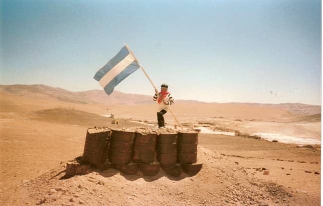 Pasamos a las 14.55 por el Salar de Arizaro. Muchas algarabías todas cantamos, otros hacen palmas. Nos acompaña un bello día que contrasta con la desértica serranía. En Caipe tenemos la grata sorpresa de encontrarnos con el camino asfaltado, casi perfecto a pesar del continuo pase de camiones de gran porte. Este se había construido para unir las distancias con la mina La Casualidad que por entonces usaban camiones pesados y especiales para transportar las cargas de azufre hacia los centros de ventas. Nos estamos acercando a una velocidad aproximada de 60 Km. p/h. Es descenso, la brisa nos besa las mejillas y nos despeina, mientras serpenteamos el camino y seguimos bajando. Salar de Arizaro vamos pasando, cual regalo de la Madre Pachamama, nos deleita con su paisaje. A la derecha de éste camino se lee un cartel que dice” Minería Rió Grande”.