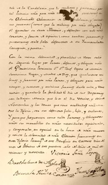 1762-23 de Febrero- Juntos y congregados los cofrades a toque de campana se hicieron las elecciones de los oficios que han de practicarse el año próximo venidero en la forma siguiente: Mayordomos Mayor y Menor, D. Anselmo y D. Francisco Villagrán; Proc. Mayor y Menor, D. Julián López y D. Prudencio Palacios-Sacristán no hay-Mayordoma Mayor Da Juliana Aybar, Da. Dionisia Villagrán. Proc. Da María Eugenia Indarte, Da. Petrona Fuenzalida, Sacristana Mayor Da. Lucía Aráoz, Mayordomo Mayor de Devoción Dr. Manuel Carrizo, Dr. Don Joseph Ignasio de Villafañe, Cura y Vicario de Belén y sus anexos ante escribano. Firmado por dicho Cura y Julián López, Notario Público. (Todo letra de Villafañe)(sic)