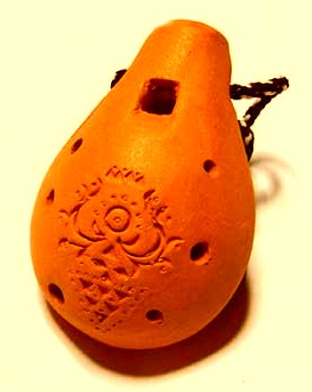 a okarina, es un pequeño instrumento de viento hecho actualmente con distintos materiales como la cerámica (predominante), madera, plástico y, en algunos casos más raros, vegetales y frutas. Es un instrumento sin llaves.