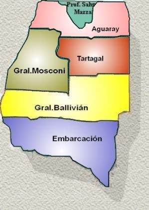 División Política: el Departamento tiene 6 municipios. La cabecera es Tartagal (1° categoría) con 2.825 km2 y 47.526 habitantes. Le siguen en importancia Embarcación y Gral. Mosconi (también de 1° categoría) Embarcación tiene 3.808 km 2 y 18.549 habitantes, Gral. Mosconi con 2.758 km2 y 16.267 habitantes. Luego vienen Aguaray y Profesor Salvador Mazza (ambos de 2° categoría) Aguaray con 2.803 km2 y 10.663 habitantes y Salvador Mazza (llamado Pocitos) tiene 361 km2 y 11.995 habitantes. Se completa con Gral. Ballivián (3° categoría) con 3.040 km2 y 1.688 habitantes.
