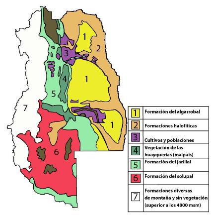 Mapa donde se representa la distribución de los distintos tipos de formaciones vegetales en el territorio provincial